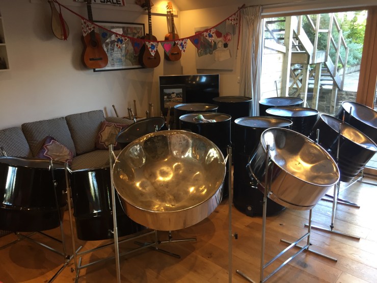 Here we are at the first rehearsal using our own pans. A bit of a squash, but worth it as they sound absolutely amazing.
